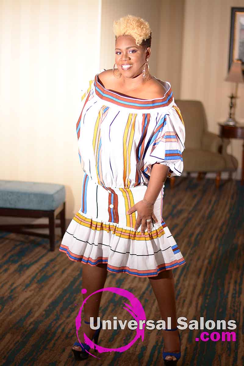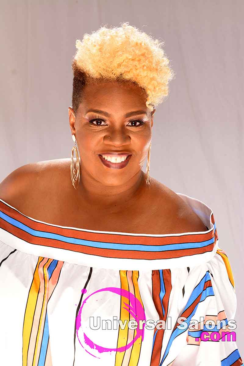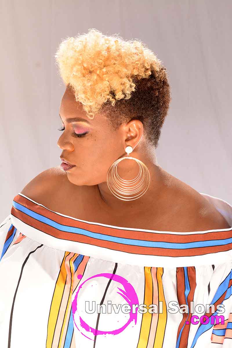 As the hair in the top is swooped over to one side, the brassy blonde hair color contrasts with the light brown underneath. The result is a tonal mixture that punctuates every bounce from every ringlet in the hair also. Brenda Barron was very careful to choose a hair color blend that would achieve the look she desired while using an application technique that ensured her client’s natural hair would remain safe and healthy.