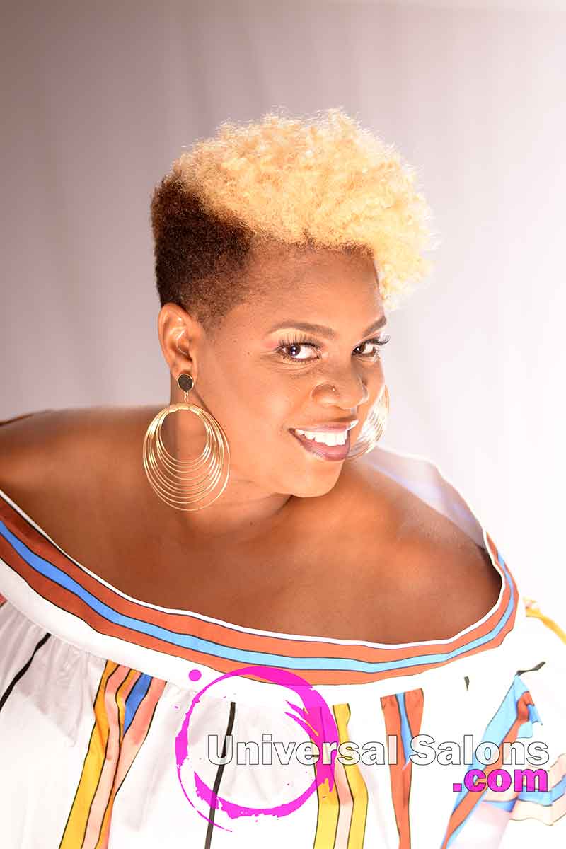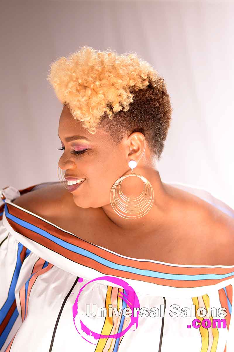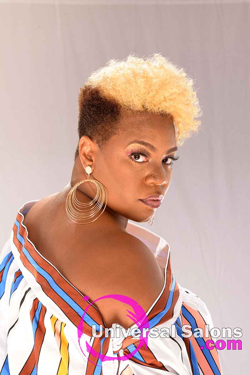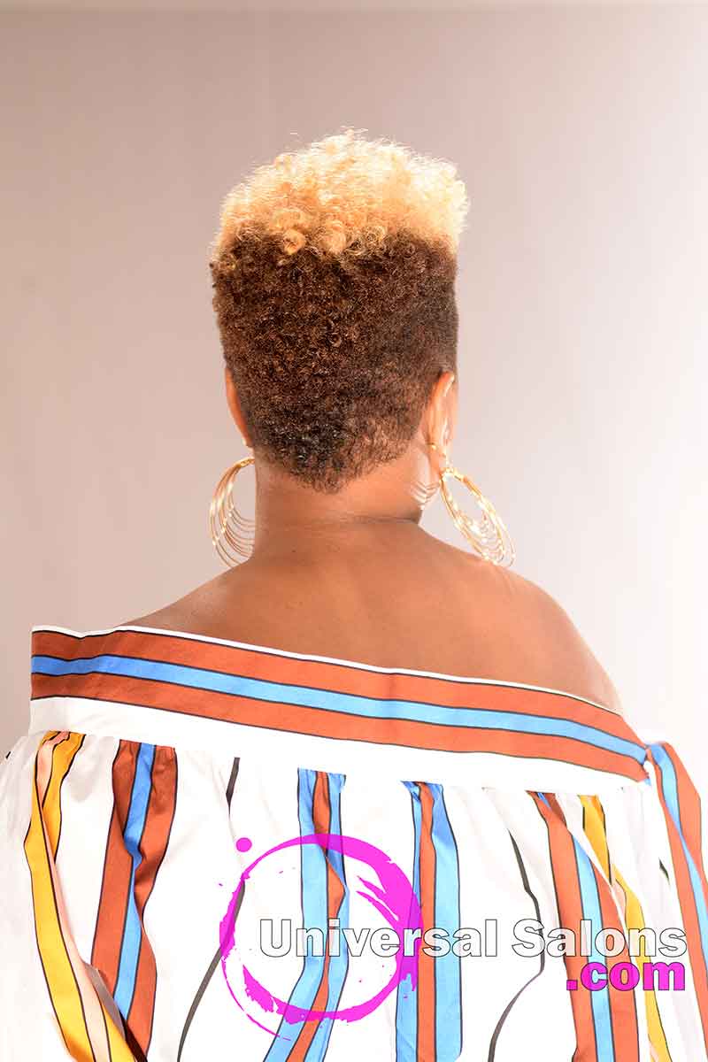 The beauty of a short, natural hairstyle like this brassy blonde curly hair mohawk is just how easy they are to maintain. Brenda Barron suggests that her model wrap her hair every night with a silk or satin bonnet or scarf. In the mornings she should simply run her fingers through her hair and add some type of oil sheen also.
